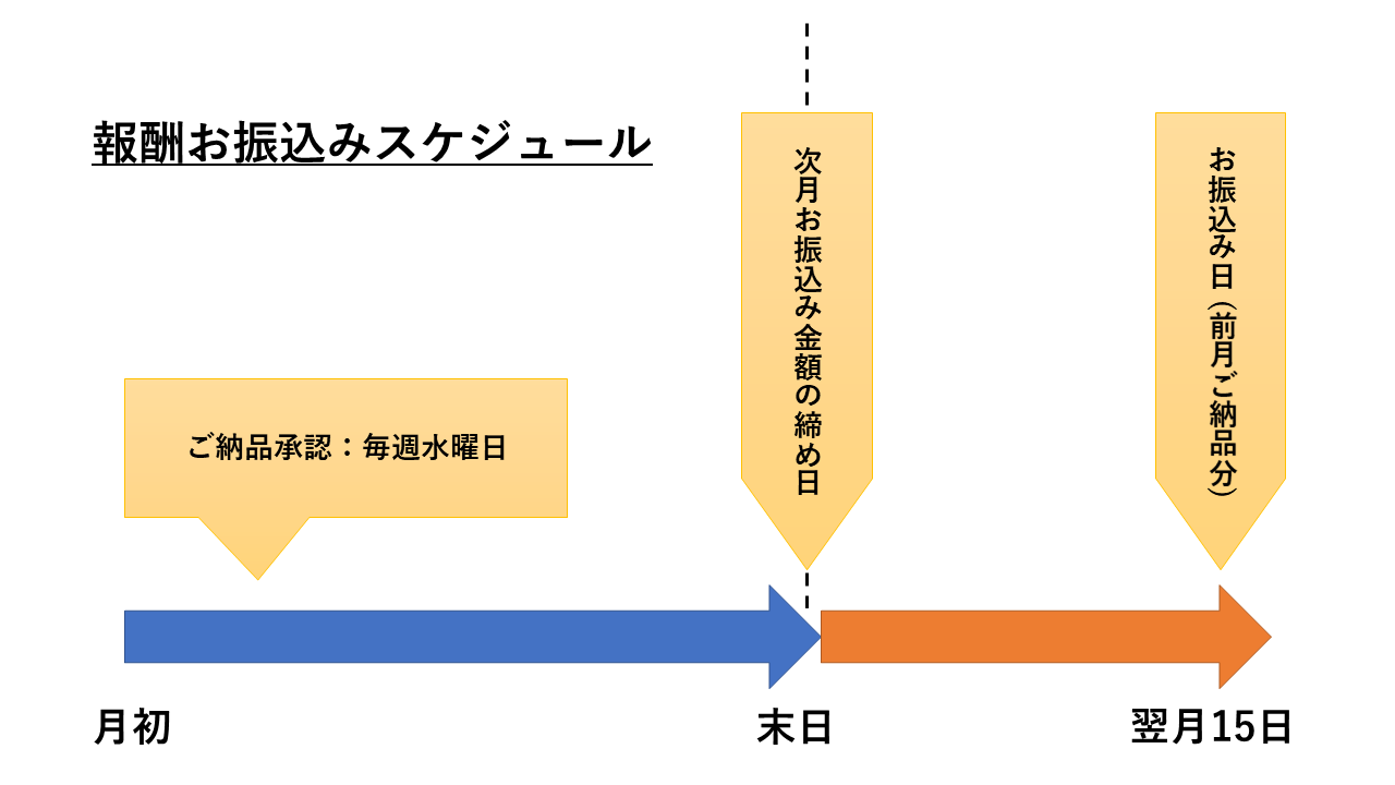 毎月末日までにご納品いただいた分のタスク報酬を翌月15日(土日祝の場合は銀行の翌営業日)にお振込みいたします。